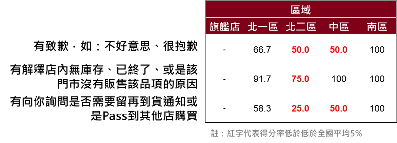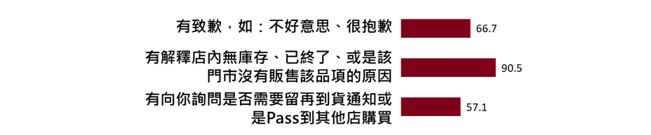 進一步拆解缺貨時的標準應對流程,在發生無庫存狀況的門市中,超過九成的人員能詳盡解釋店內無庫存的原因。然而,真正的服務差異,往往發生在「解釋完之後」。數據客觀地指出,在告知缺貨後,僅有 66.7% 的人員會主動致歉 ;更關鍵的是,有57.1% 的人員會往前多走一步,主動詢問是否需要留下到貨通知,或是協助轉介到其他店舖購買。